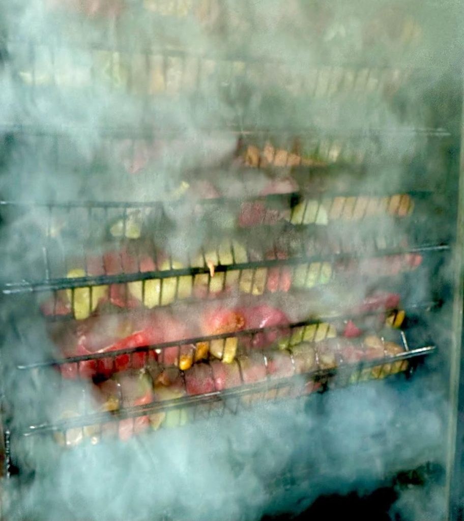 After preparation and halving, selected chilies are exposed to real smoke before any final drying takes place.