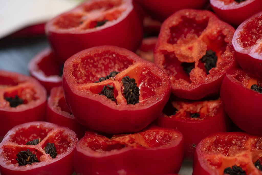 Each chili is halved individually, lengthwise. During this step, the stems are removed and most of the seeds are taken out — not to reduce heat, but to improve consistency, cleanliness, and how the chili behaves during drying or smoking.