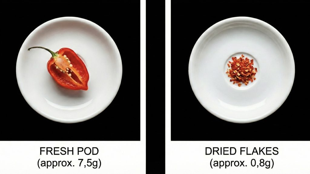 During drying, chilies can lose up to nine tenths of their original weight. In practical terms, a 10 g Vault product typically represents around 100 g of fresh chili before processing.