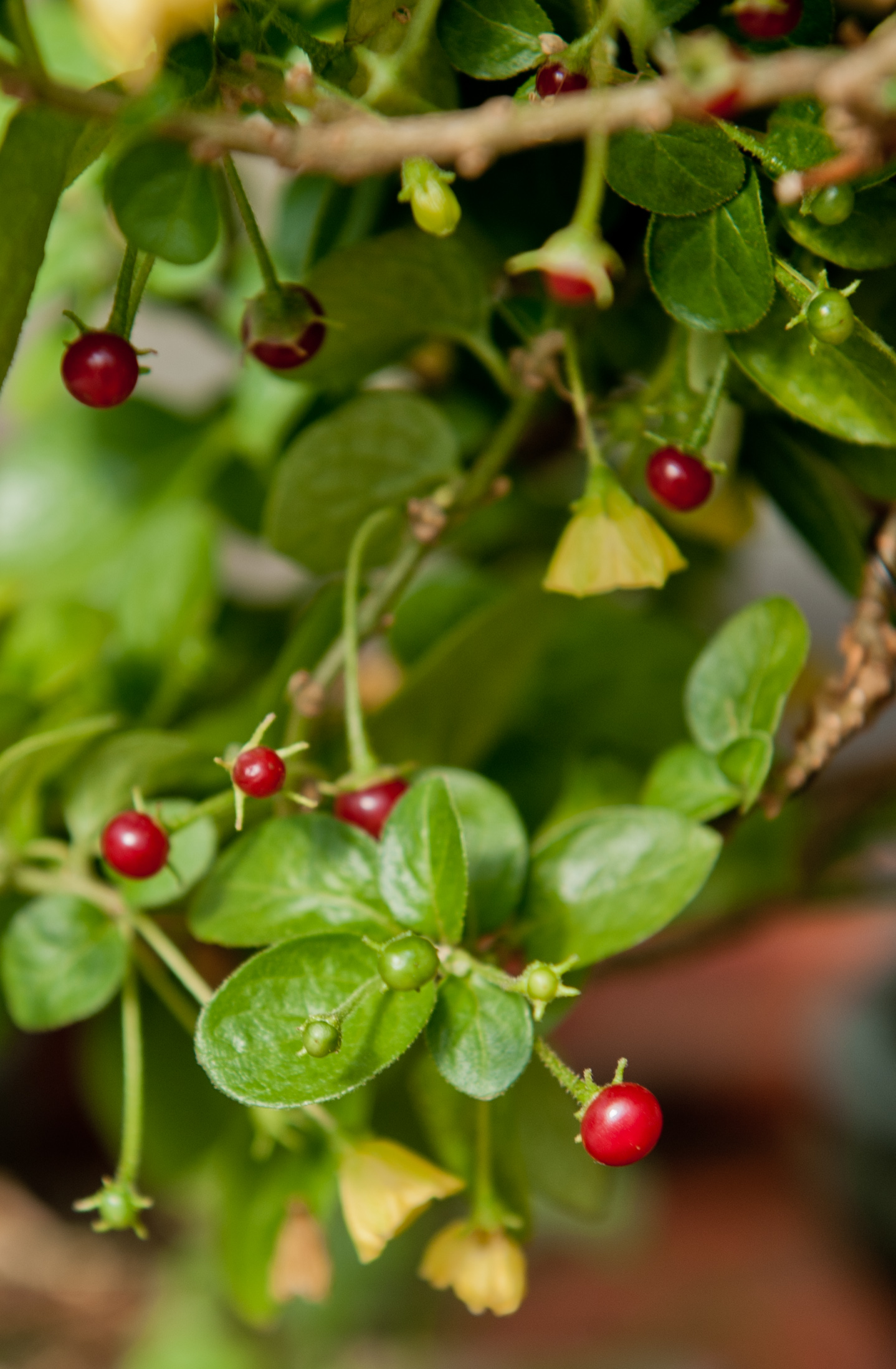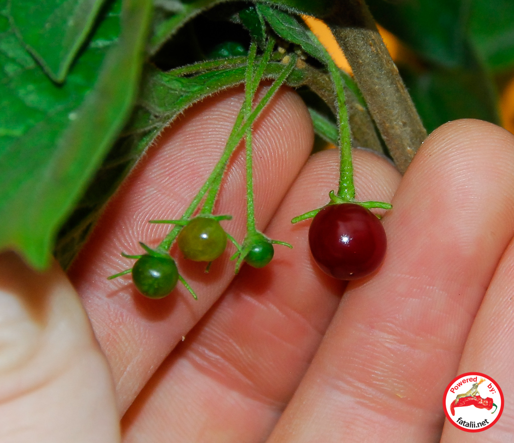 The plant is strange looking, to say the least. It doesn’t resemble much any other chile plant – confusion has therefore been understandable. Rhomboideum is a relatively big plant with few, very long branches. Leaves growing from those branches are light green, clearly pubescent and unusually round in their shape. The medium-sized leaves stay unusually firmly attached to the plant (C. pubescens shares this trait). Flower is small, bell-shaped and bright yellow. Unusually long calyx teeth emphasize the small size of the clearly depressed, translucent berries which mature from green to white to red. There are only 1-2 seeds in the tiny berry. There is no pungency, but slight, pleasant sweetness is present in ripe fruits.