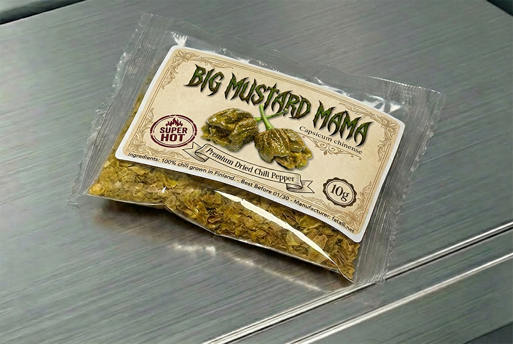 Every 10 g Vault package contains 100% premium dried chili flakes, grown and processed entirely in Finland. Pods are harvested fully ripe, prepared by hand, and dried slowly to preserve both aromatic oils and capsaicin density. As with all Vault selections, only batches that retain clarity and balance after processing are released.