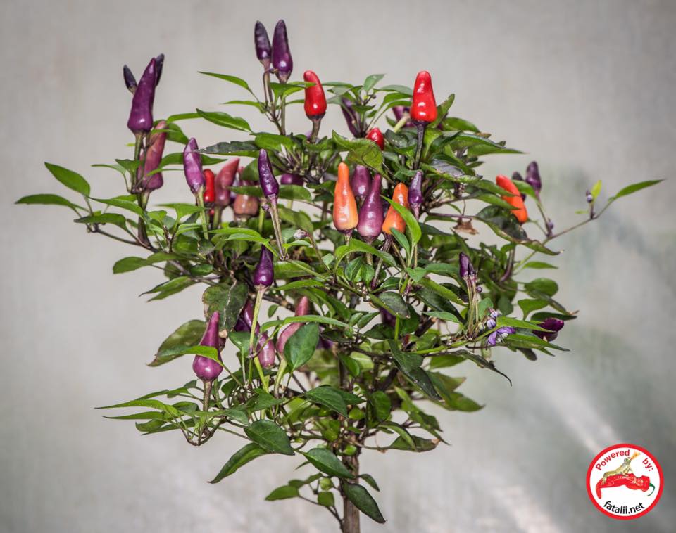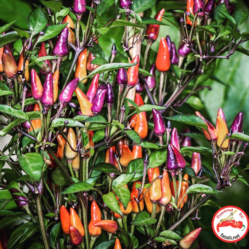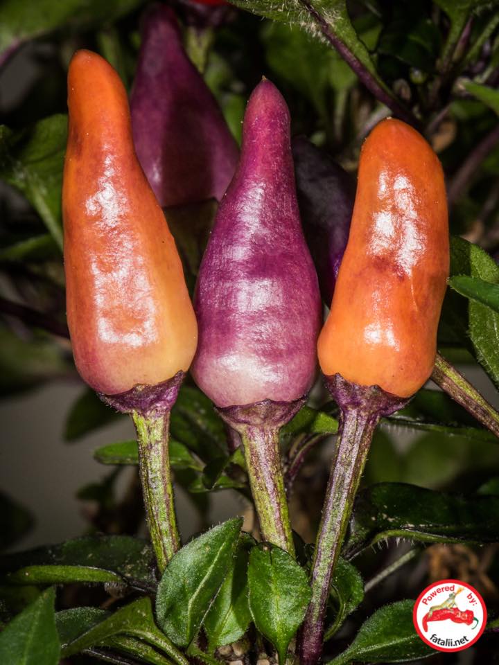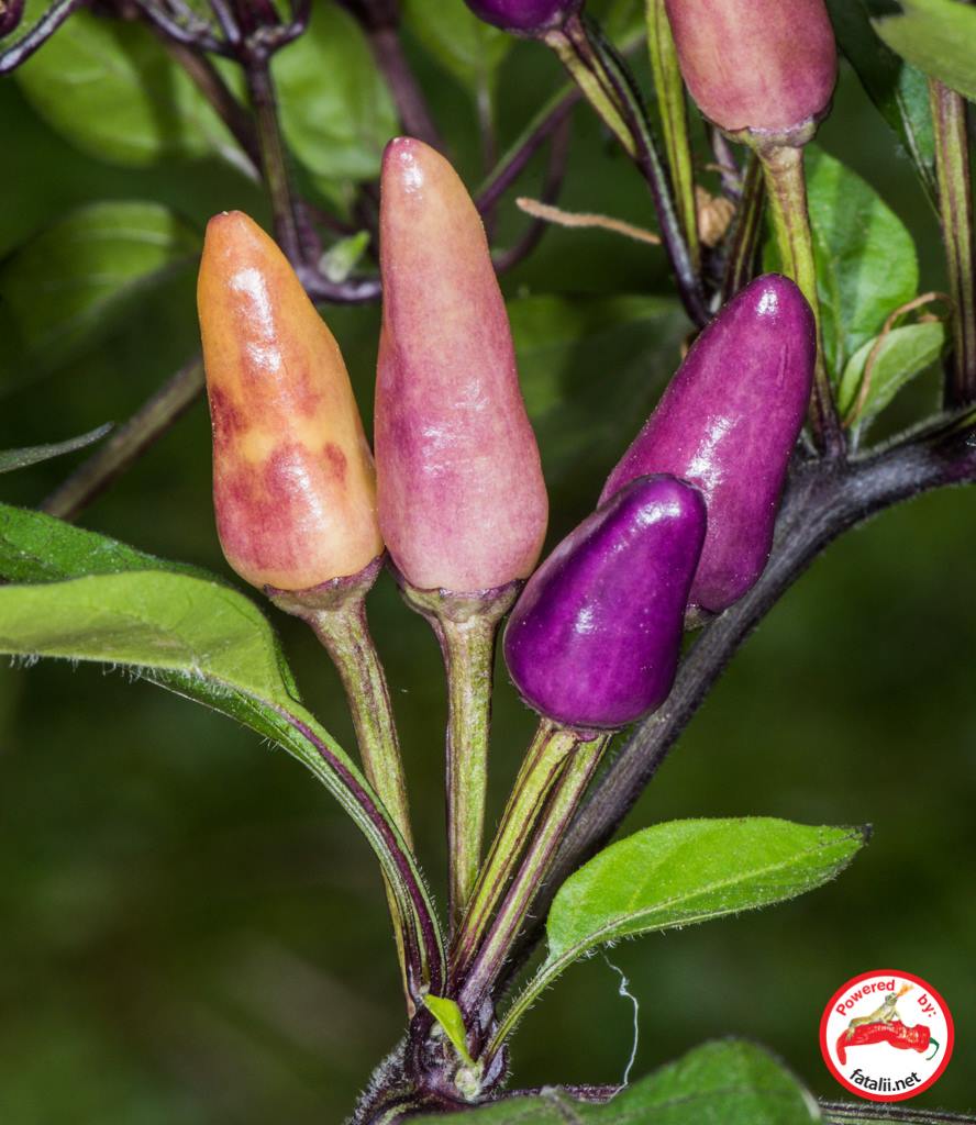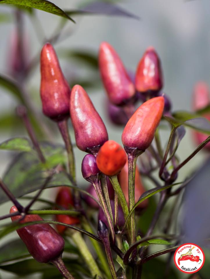 Very pretty ornamental pepper which ripens from purple to pink, to red in shades of different colors in between. Looks great when maturing. Not as hot as many other ornamental peppers. The powder is better than most ornamentals also. Very compact plant. Pretty as small ornamental pepper or bonchi.